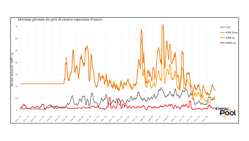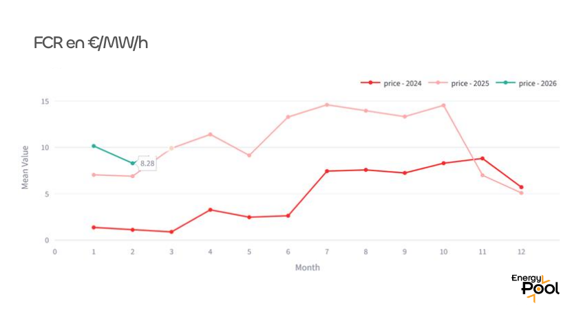 À l’inverse, le marché de capacité FCR reste orienté à la hausse, avec +20 % sur un an, après une hausse spectaculaire observée entre 2024 et 2025.